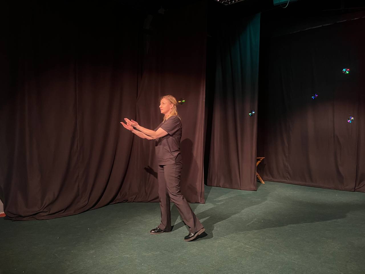 Участники погрузились в основы сценического искусства. Мария доступно и интересно объяснила, что такое этюды — небольшие импровизационные сценки, где актер должен прожить определенную ситуацию без заранее выученного текста. Она рассказала, как правильно выстраивать сценку от замысла до финала, куда важно смотреть, как двигаться и взаимодействовать с партнером на сцене.