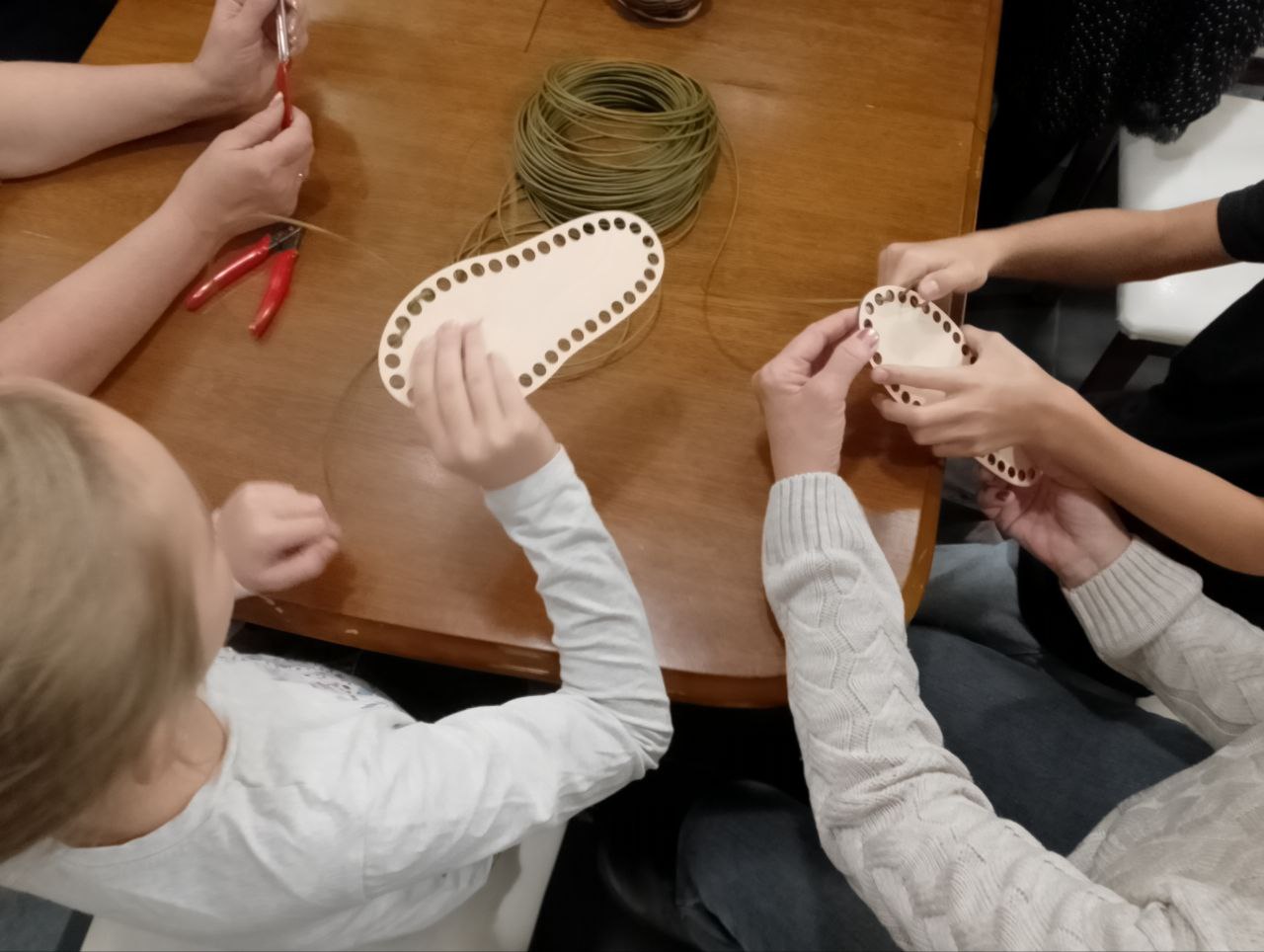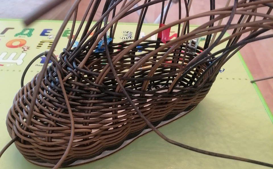 Особый восторг у детей вызвал момент, когда обычные на первый взгляд прутья в умелых руках начали превращаться в изящные элементы будущего башмачка. Процесс создания кашпо потребовал от участников не только творческого подхода, но и слаженной работы. Родители помогали детям аккуратно сгибать прутья, формируя основу башмачка, вместе создавая своё творение.