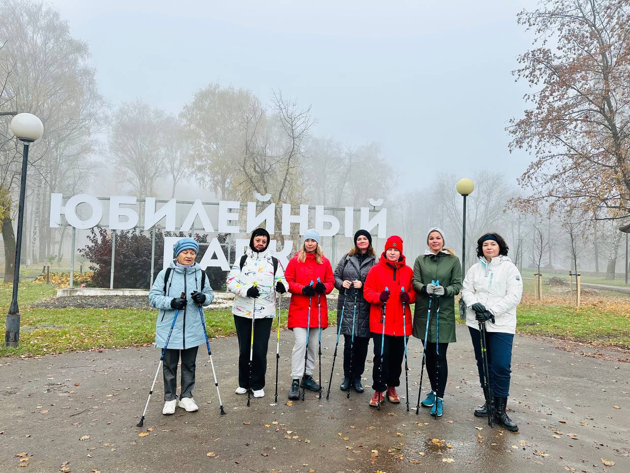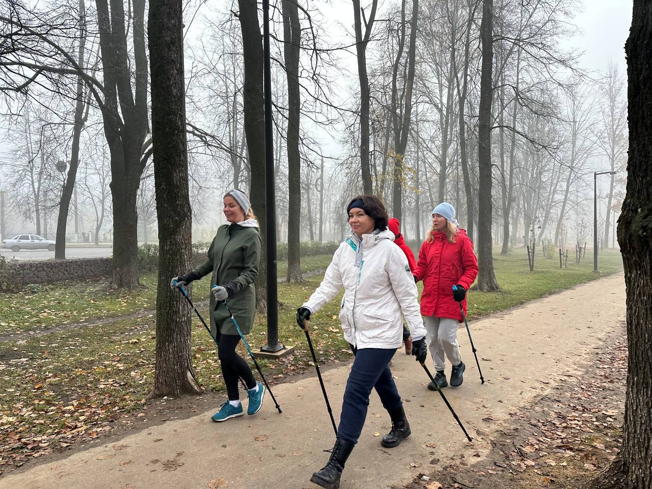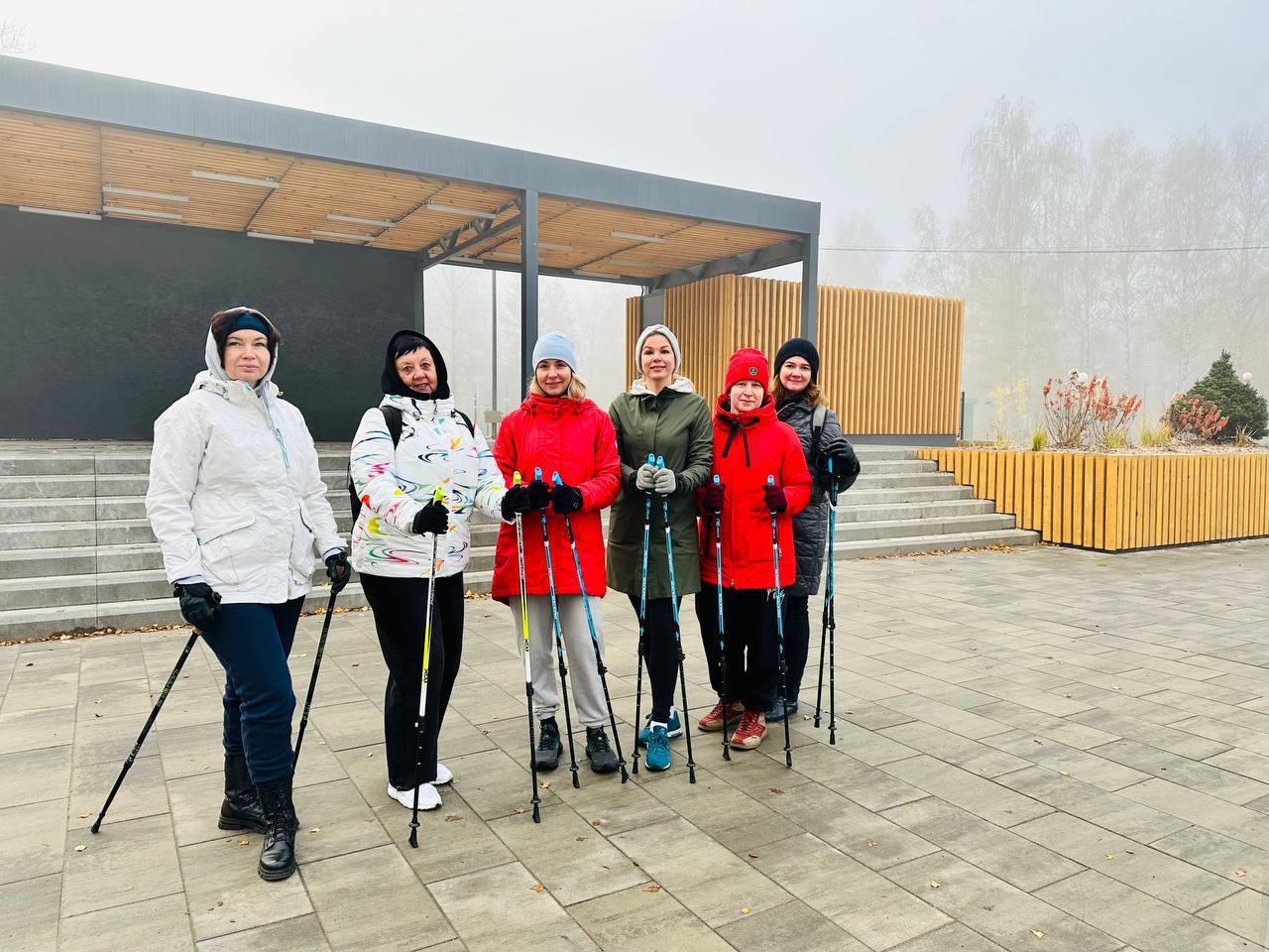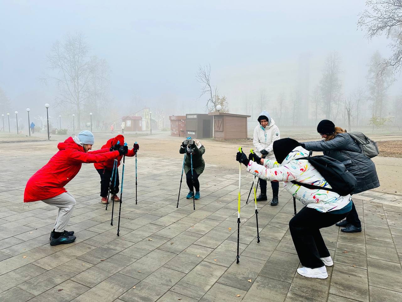 Пока остальные потягивались за чашкой кофе и завтракали, наши мамочки отправились покорять туманный парк с палками для скандинавской ходьбы!