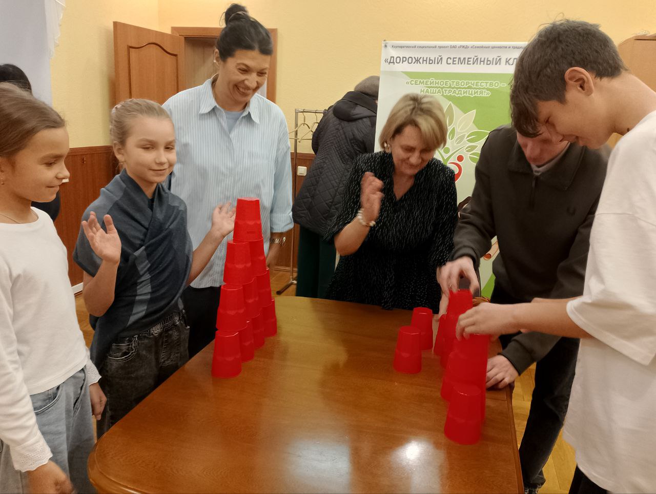Ура! У нас игра! А в этой игре семейным командам предстояло пройти несколько этапов, где требовалась не только быстрая реакция, но и слаженность всех членов семьи. Дети и взрослые с равным энтузиазмом строили из стаканчиков башни на скорость и даже пытались забросить «снаряды» в мишень с расстояния. Мячики то и дело выскальзывали из стаканчиков и весело подпрыгивали по всему залу, вызывая взрывы смеха.