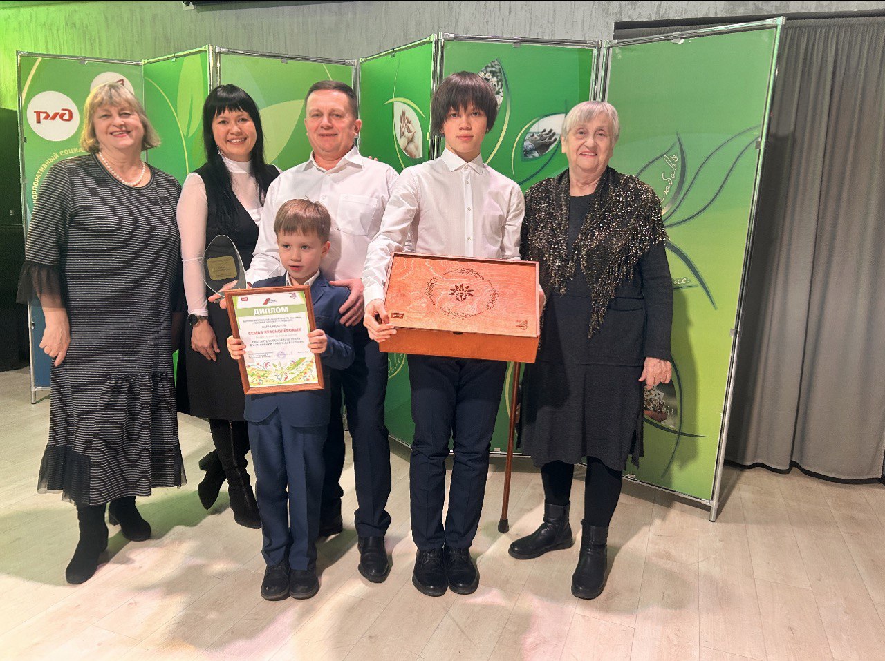 И все вместе мы традиционно исполнили любимые и самые красивые песни о семье и любви, бабушки танцевали с внуками, мамы с папами под песню «Как прекрасен этот мир», артисты Шоу -проекта Вневременье поделились историей рождения в их коллективе новой семьи-Алины Повод и Дениса Васильева, все вместе мы насладились их свадебными фото, а Денис подарил своей жене авторскую песню! Большим подарком для всех присутствующих стал розыгрыш путёвки в Реабиллитационный Центр восстановления трудовых ресурсов железнодорожников на озере Арахлей!