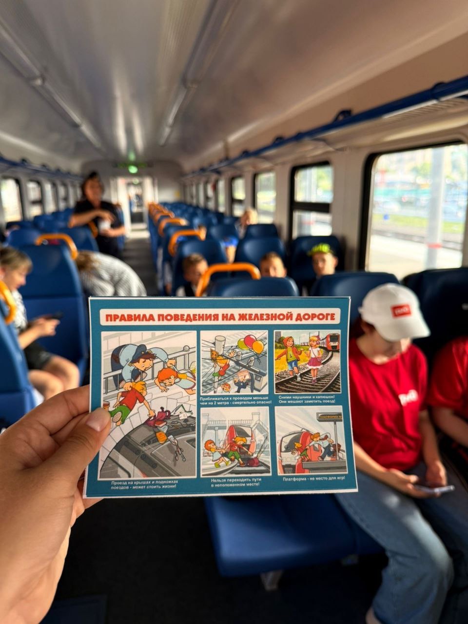 В вагоне электрички специально для юных пассажиров майор полиции, старший инспектор по делам несовершеннолетних Владивостокского линейного управления на транспорте Виктория Шестухина провела урок по безопасности и викторину. Дети познакомились с правилами поведения на железнодорожном транспорте «Уступи дорогу поездам». Поездка была увлекательной, ведь многие дети впервые ехали в электропоезде.