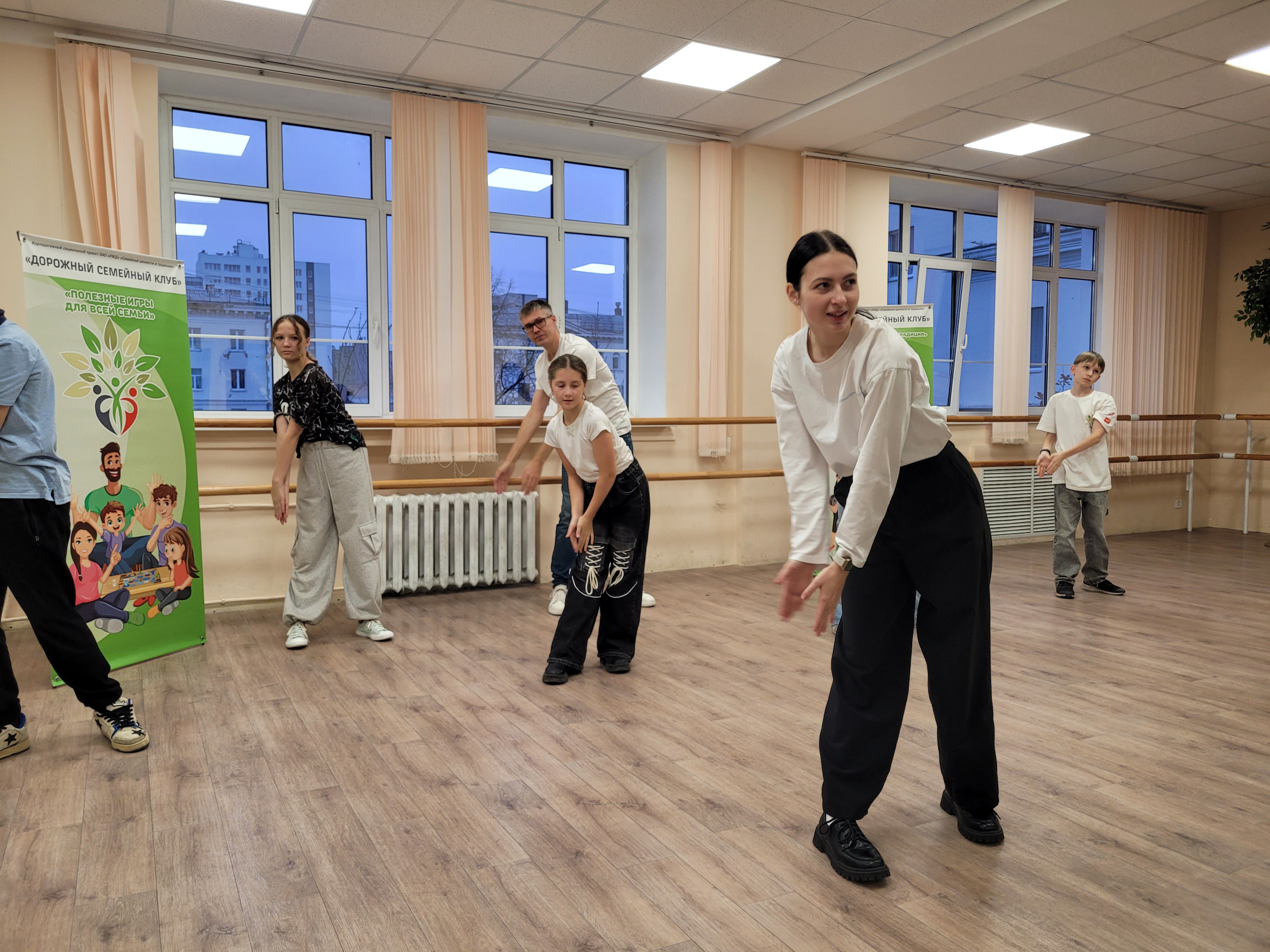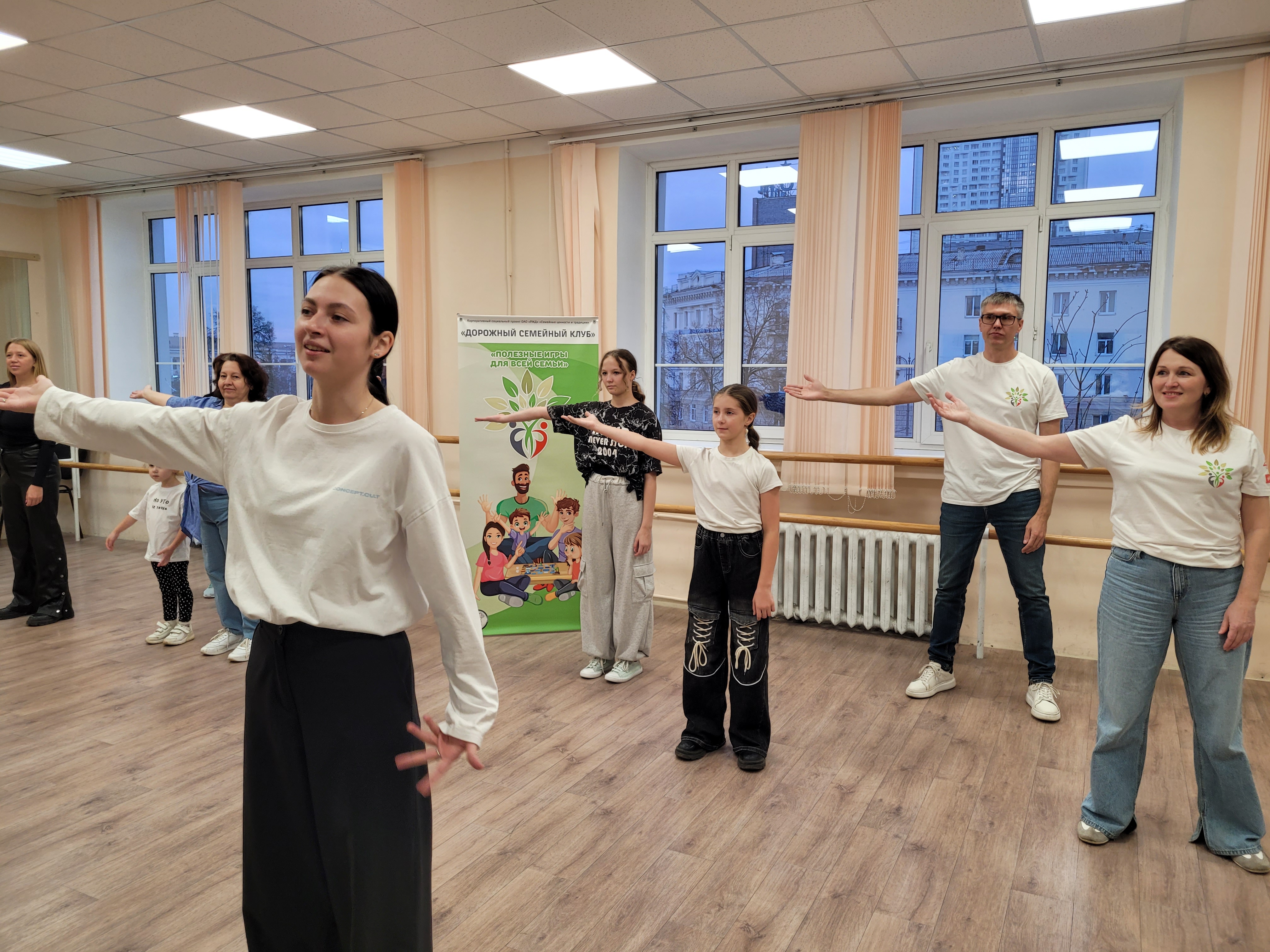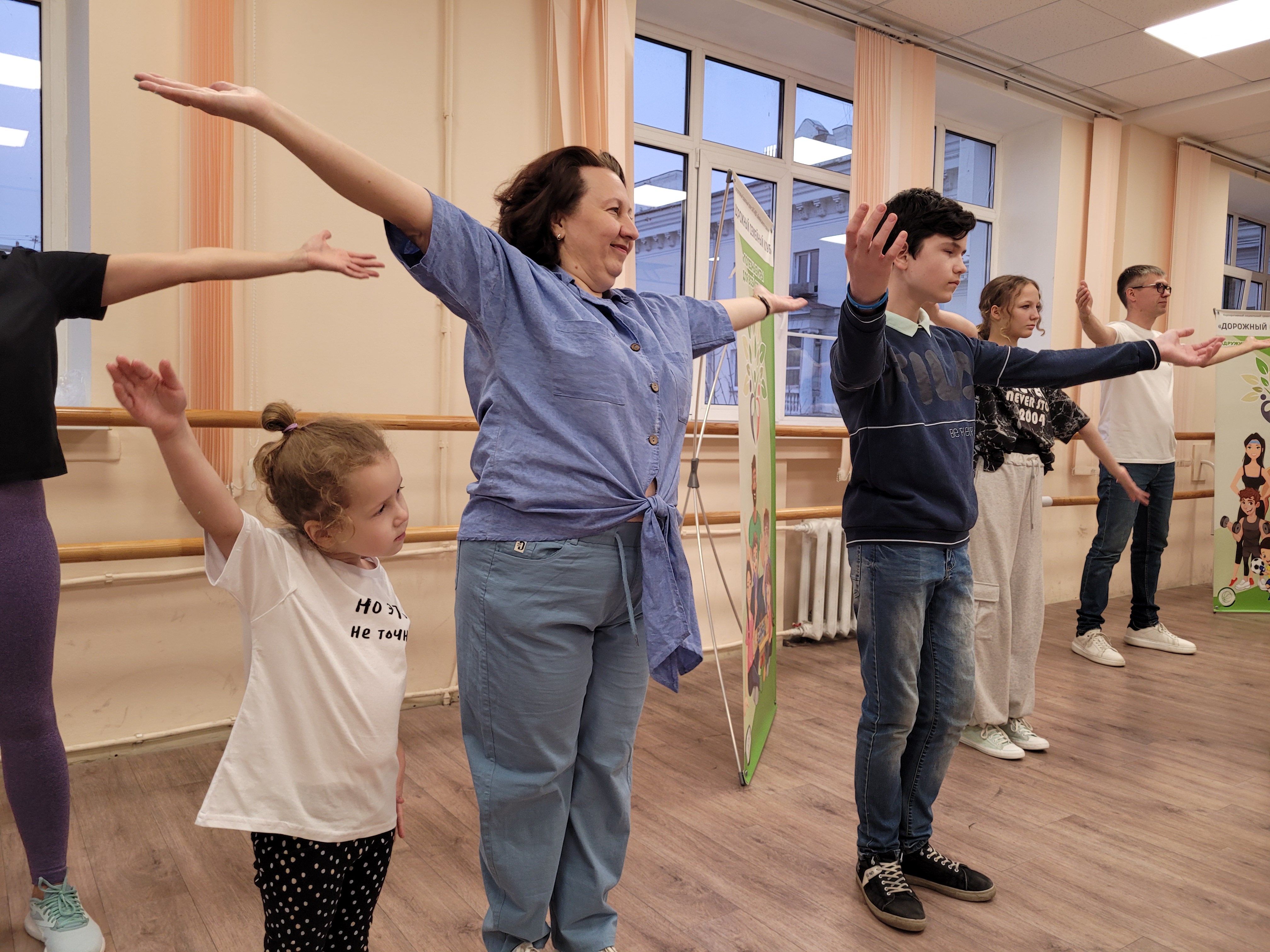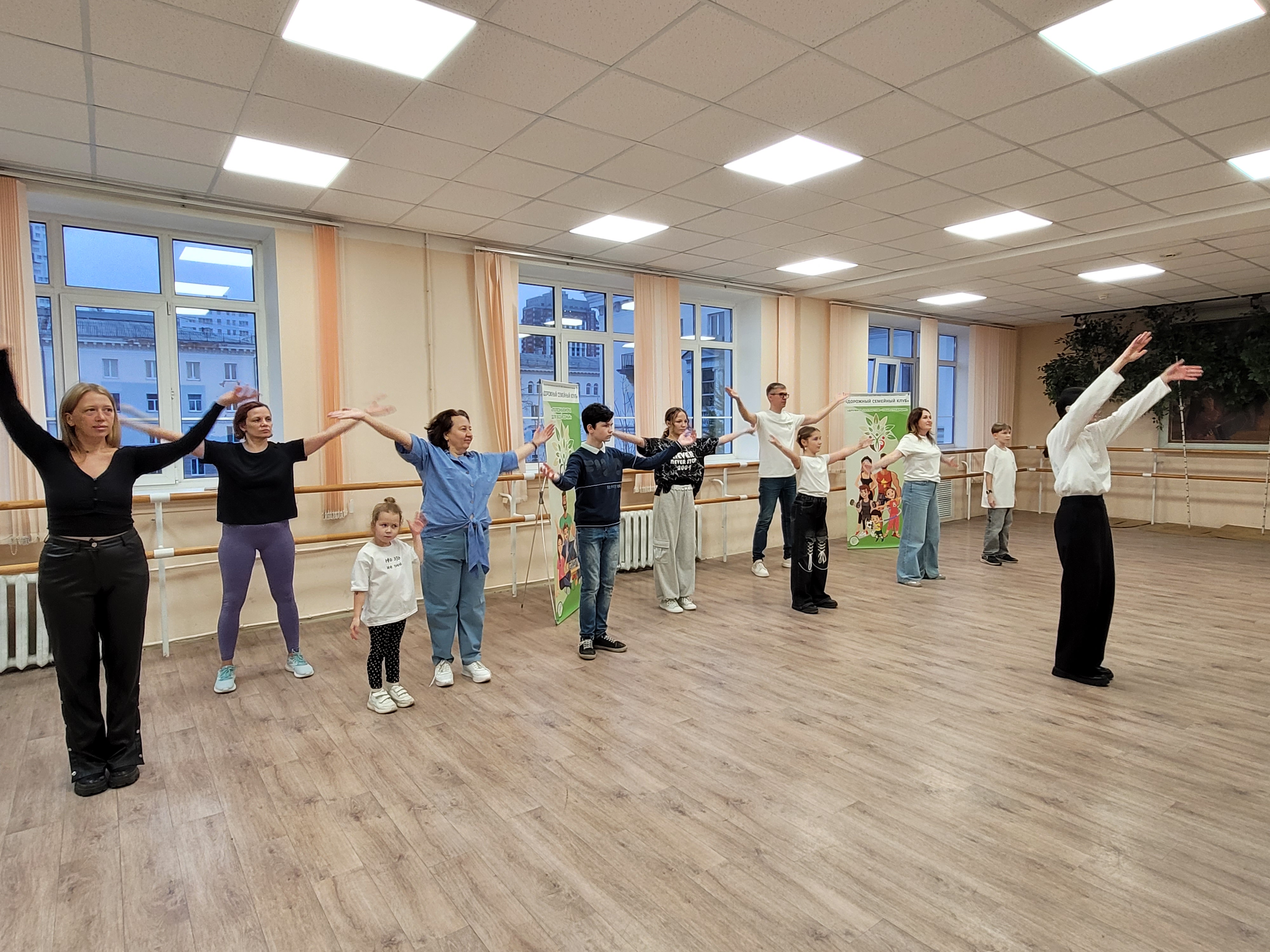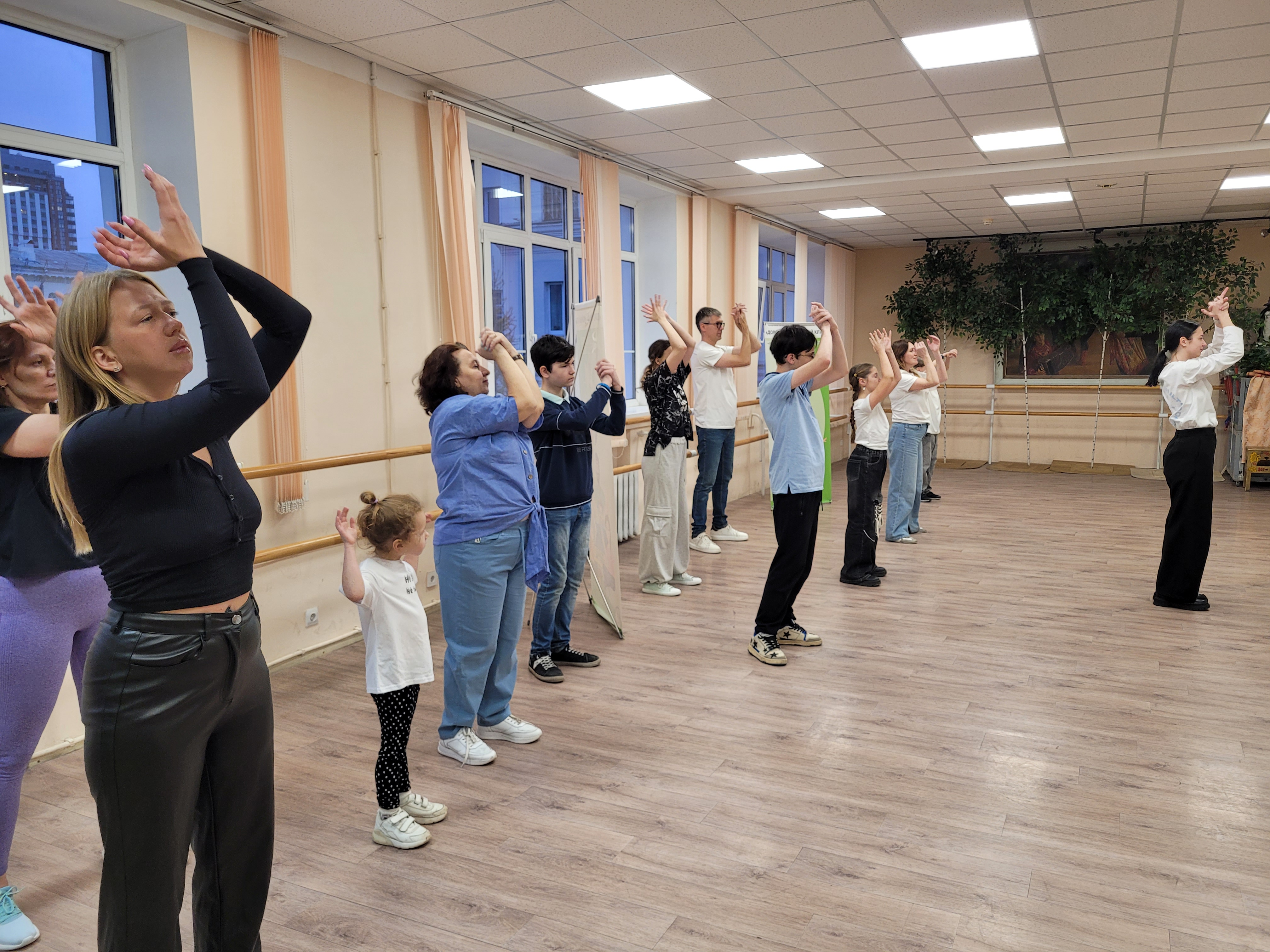 Вместе с хореографом семьи провели разминку, мы выучили танец под зажигательную музыку со смыслом.
