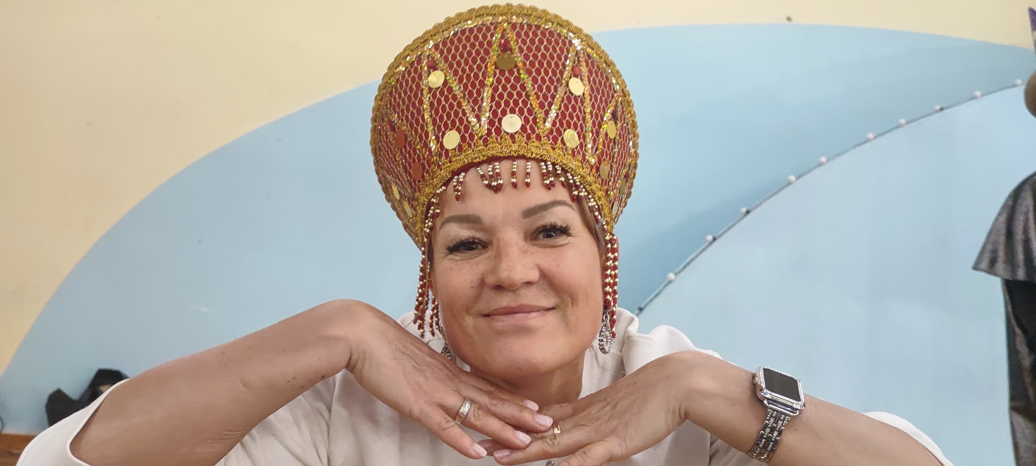 - Кокошник — традиционный народный головной убор, создающий образ женщины с достоинством и грацией, чьи движения плавны и изящны, отражая красоту и культуру родных мест.
