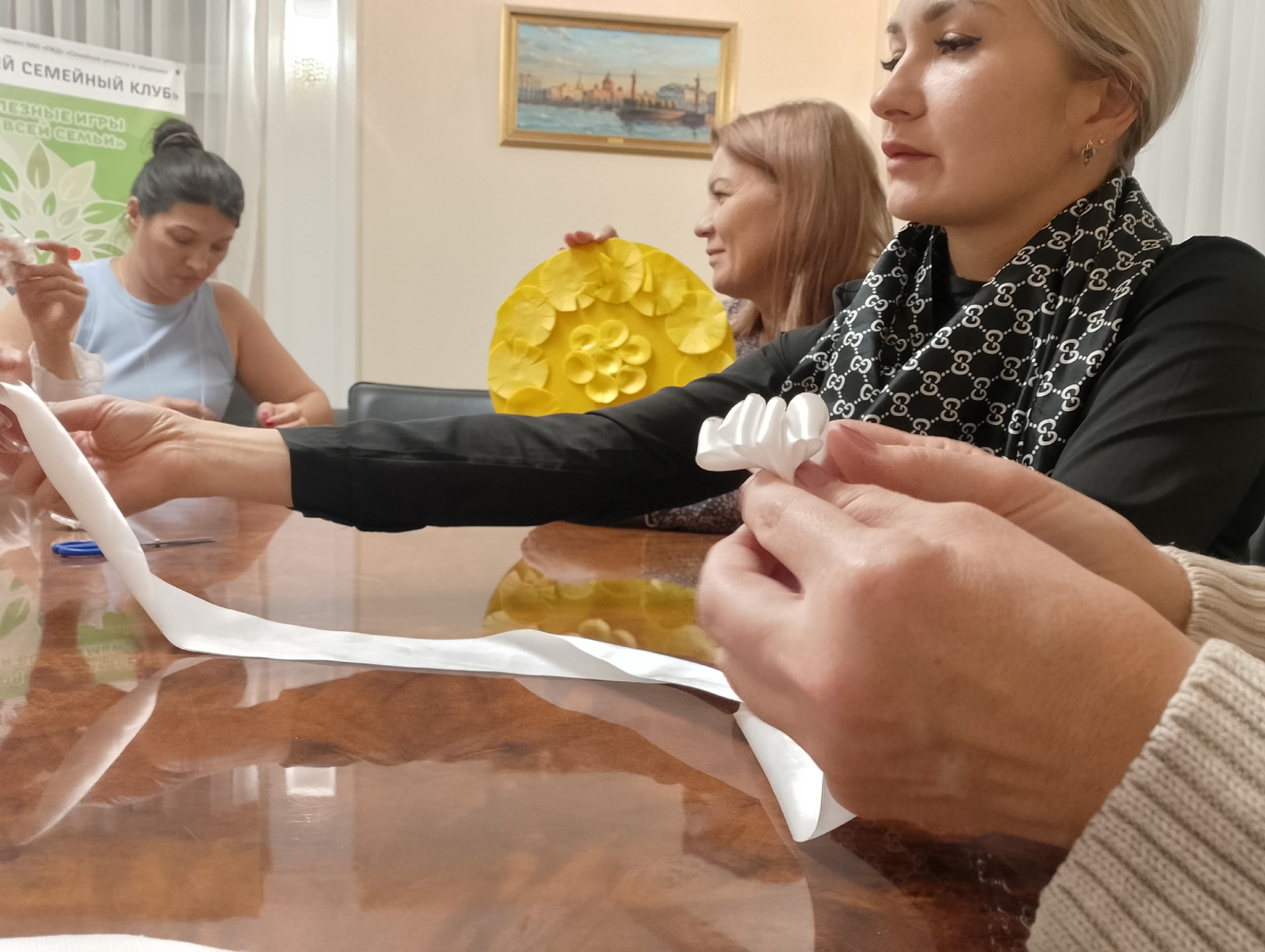 В уютной творческой атмосфере каждая семья с особым чувством подошла к созданию своего цветка. Дети старательно складывали ленты, чтобы получились лепесточки, родители помогали и наблюдали, как в руках младших поколений рождается символ семейного счастья.