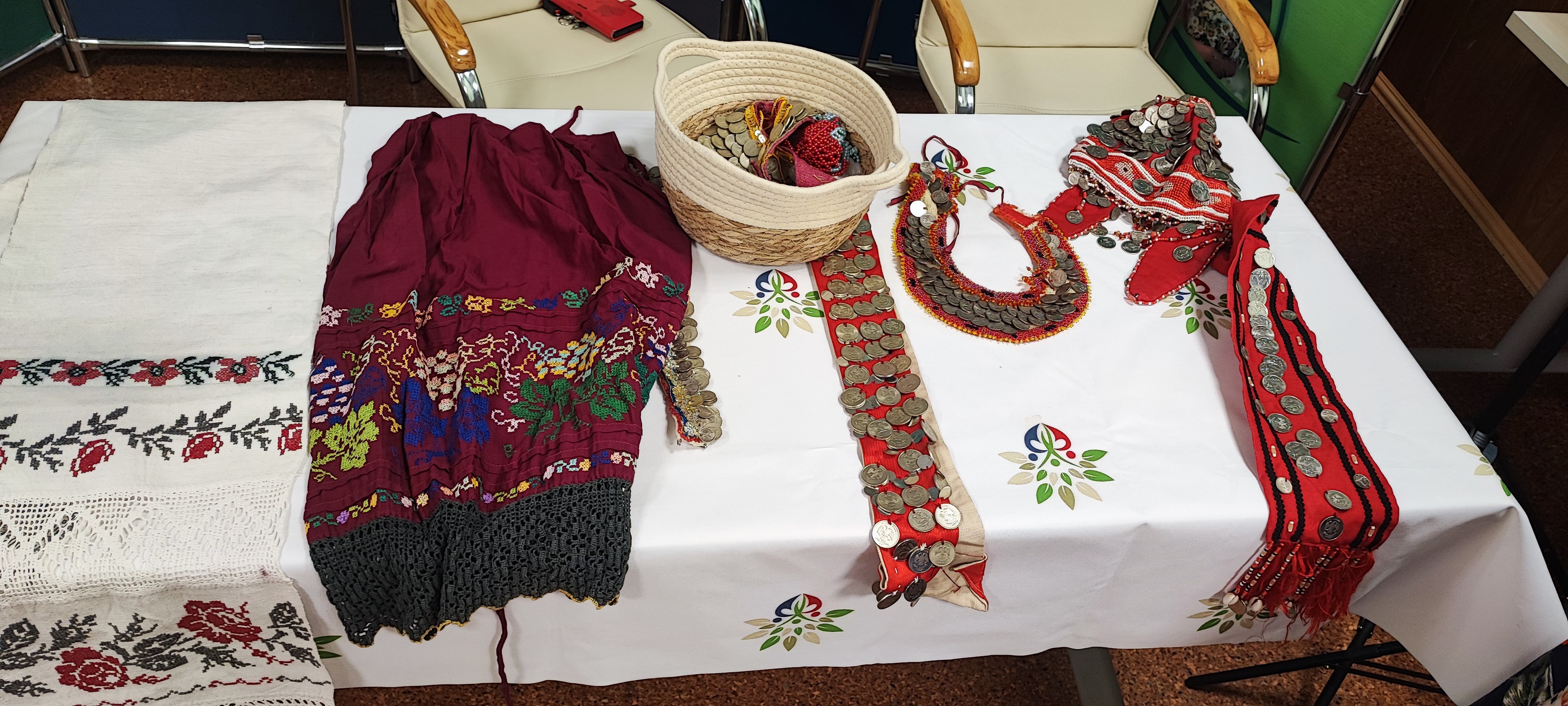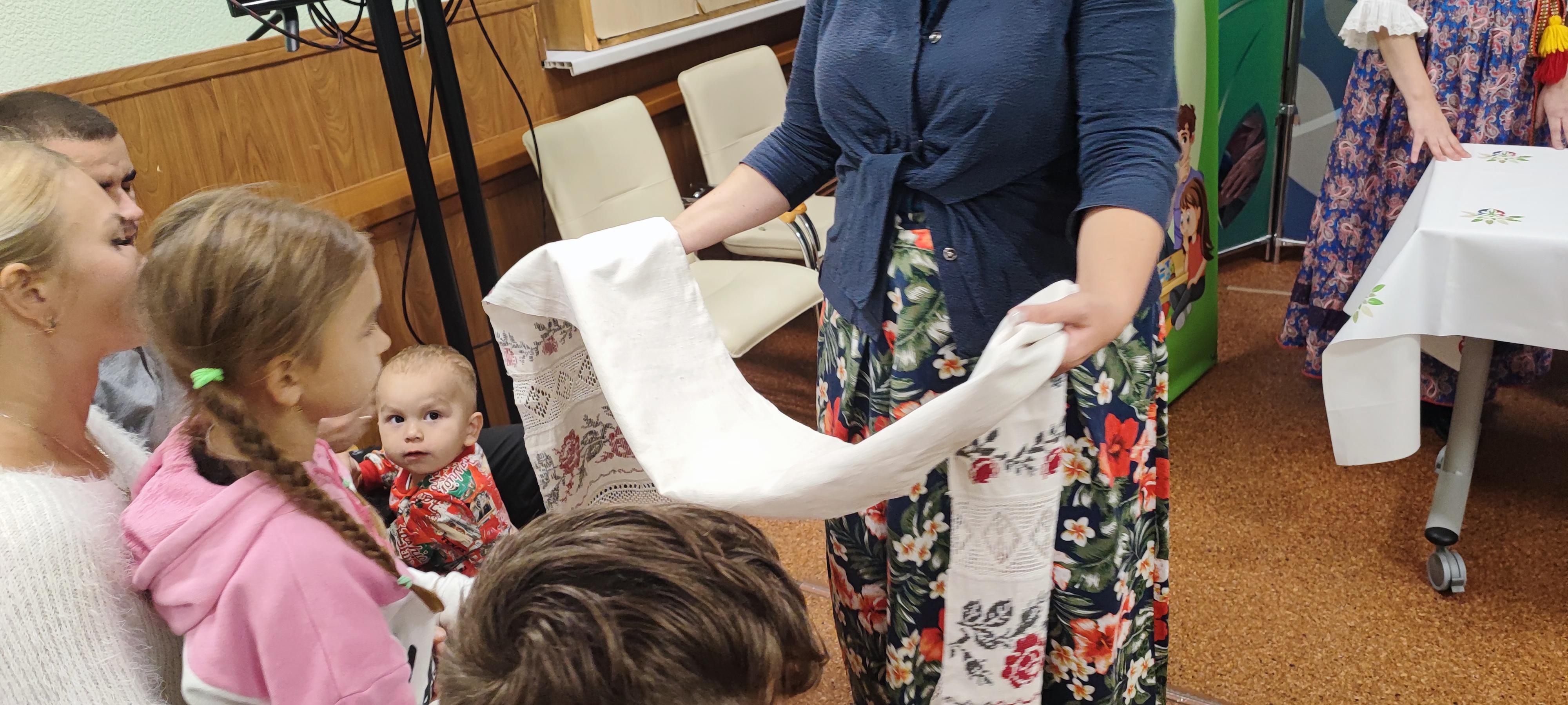 Екатерина и Галина рассказали что национальный костюм демонстрирует мудрость и рациональное мышление народа, отражает представление об идеале женщины и мужчины, культурные нормы. Народная одежда практична, адаптирована к климату и образу жизни, отражает статус и возраст человека, а крой народного костюма - это верх рациональности, ведь не пропадает ни одного кусочка ткани, из простых прямоугольников и треугольников создаются самые различные красивые и пышные наряды. Взрослым и детям было интересно узнать, что чувашское платье может "расти" вместе с девушкой - по мере ее роста к домотканному платью подшиваются оборки из красивой покупной материи. Также мог расти и сарафан, по подолу которого заложены специальные ростовые складочки.