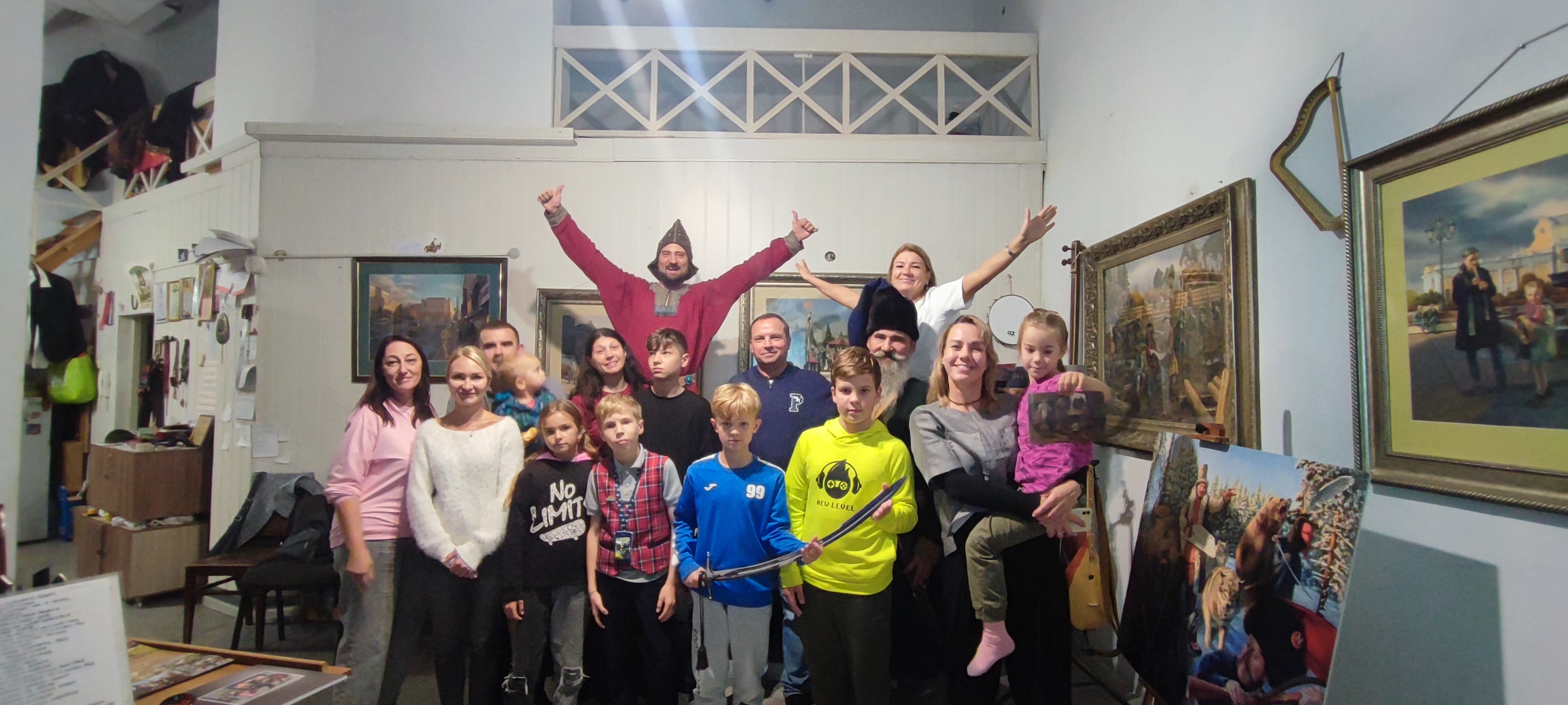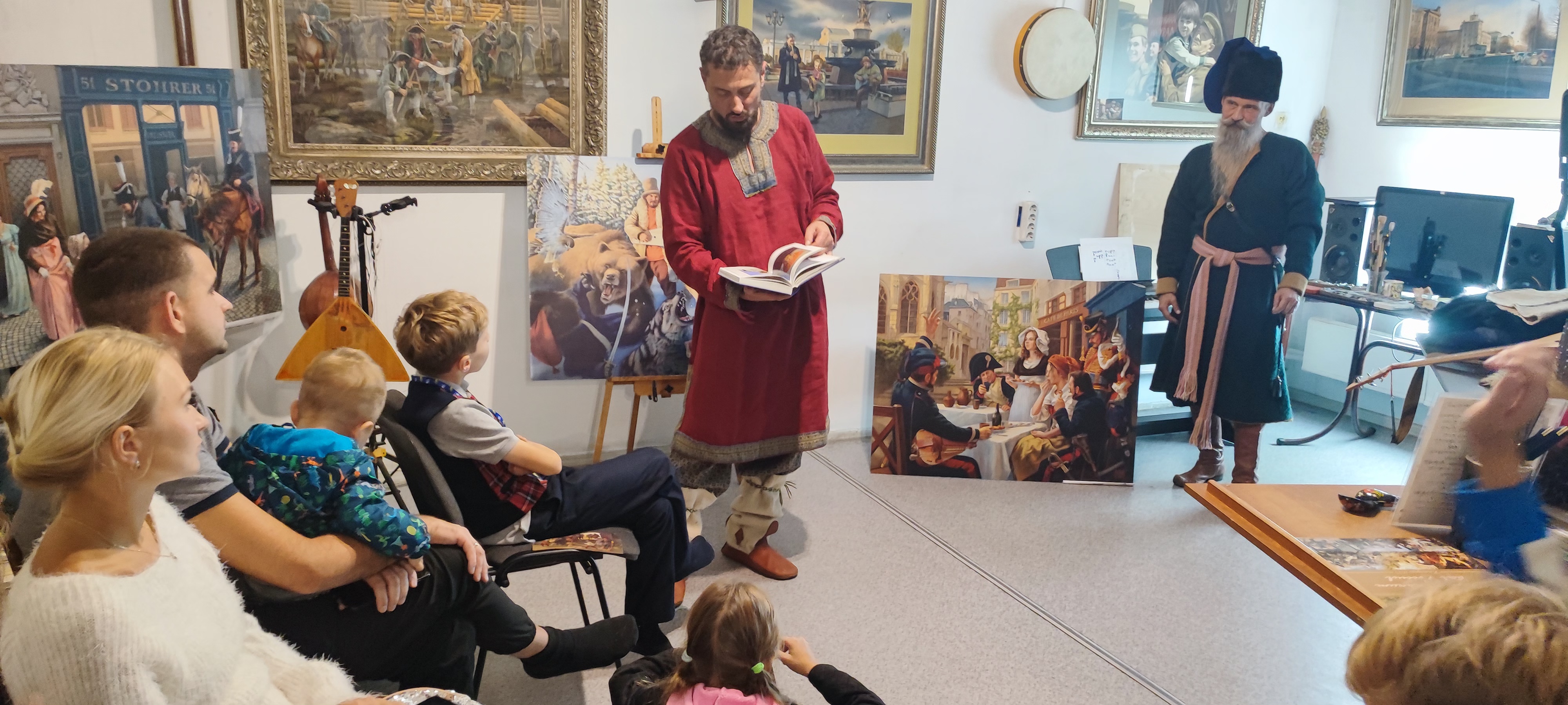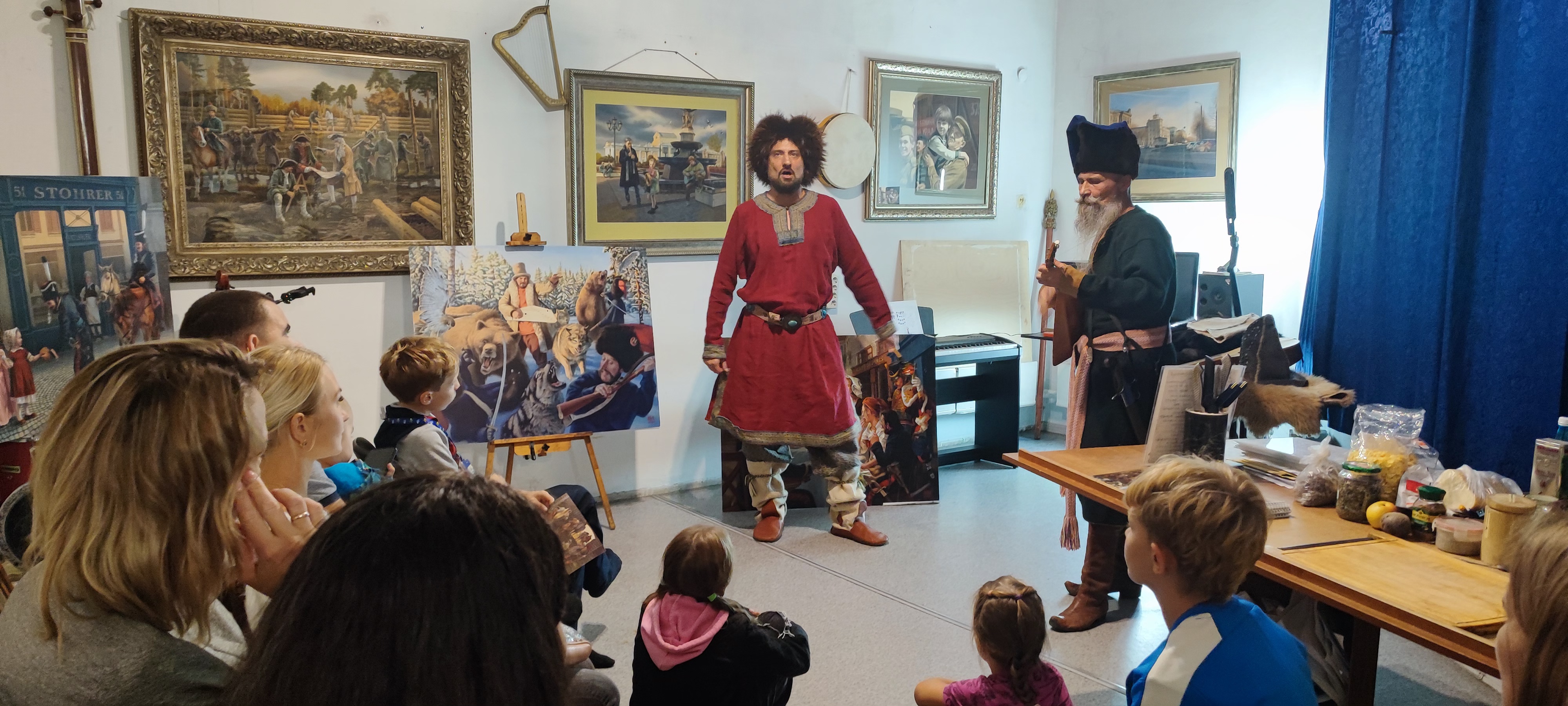 Мастерская Уральского эпоса - это творческий коллектив, в котором объединились историк - реконструктор, писатель, художник, профессиональные музыканты и исполнители, с целью воспеть через авторские песни и картины наш родной Южный Урал. Экскурсию по картинам об историческом и современном городе провел лично сам руководитель мастерской, художник-акварелист и реконструктор Михаил Воронов - Кушаковский. Под вкусный чай, дети и родители дорожного семейного клуба побеседовали с коллективом мастера, узнали об их новых идеях и творческих задумках. Семьи смогли окунуться в атмосферу творческой лаборатории, рассмотреть старинные костюмы, оружие и предметы быта, услышать звучание старинных музыкальных инструментов, и послушать песни и сказы о славных подвигах предков.
