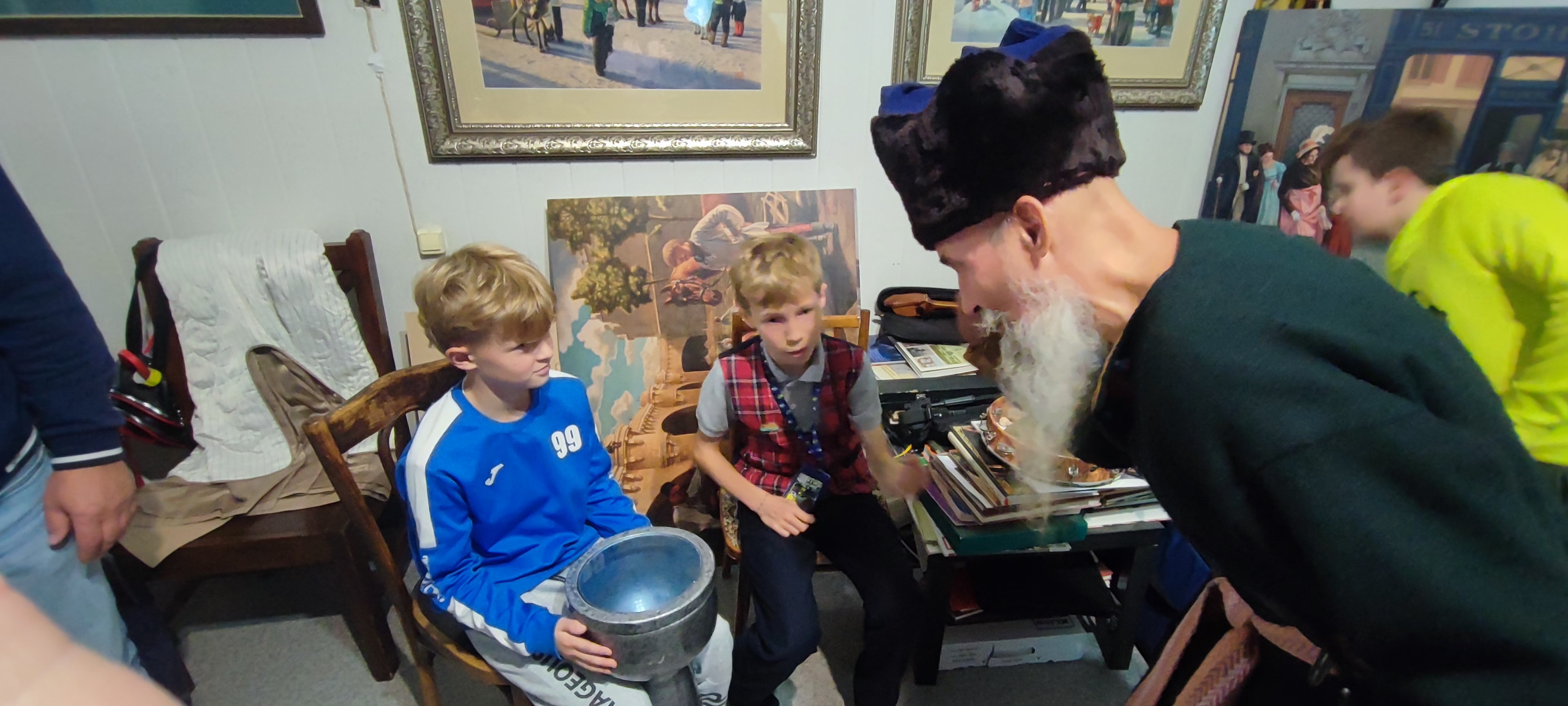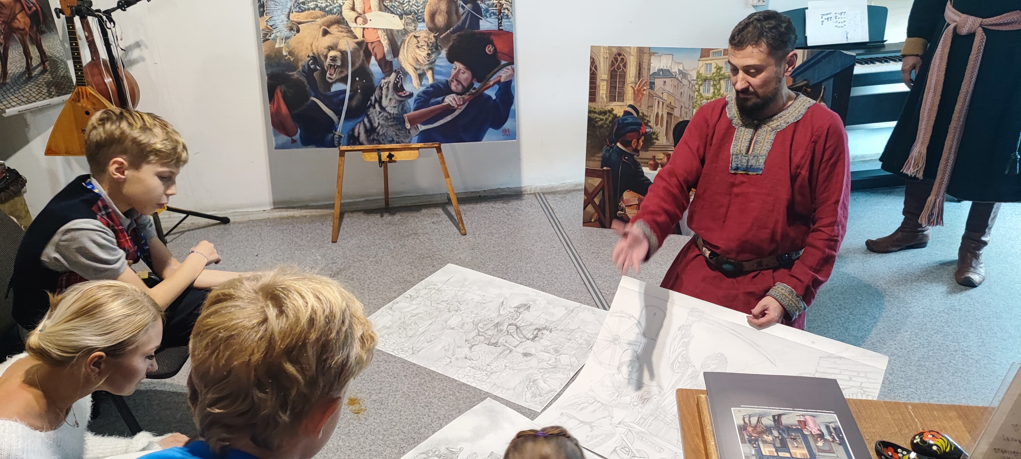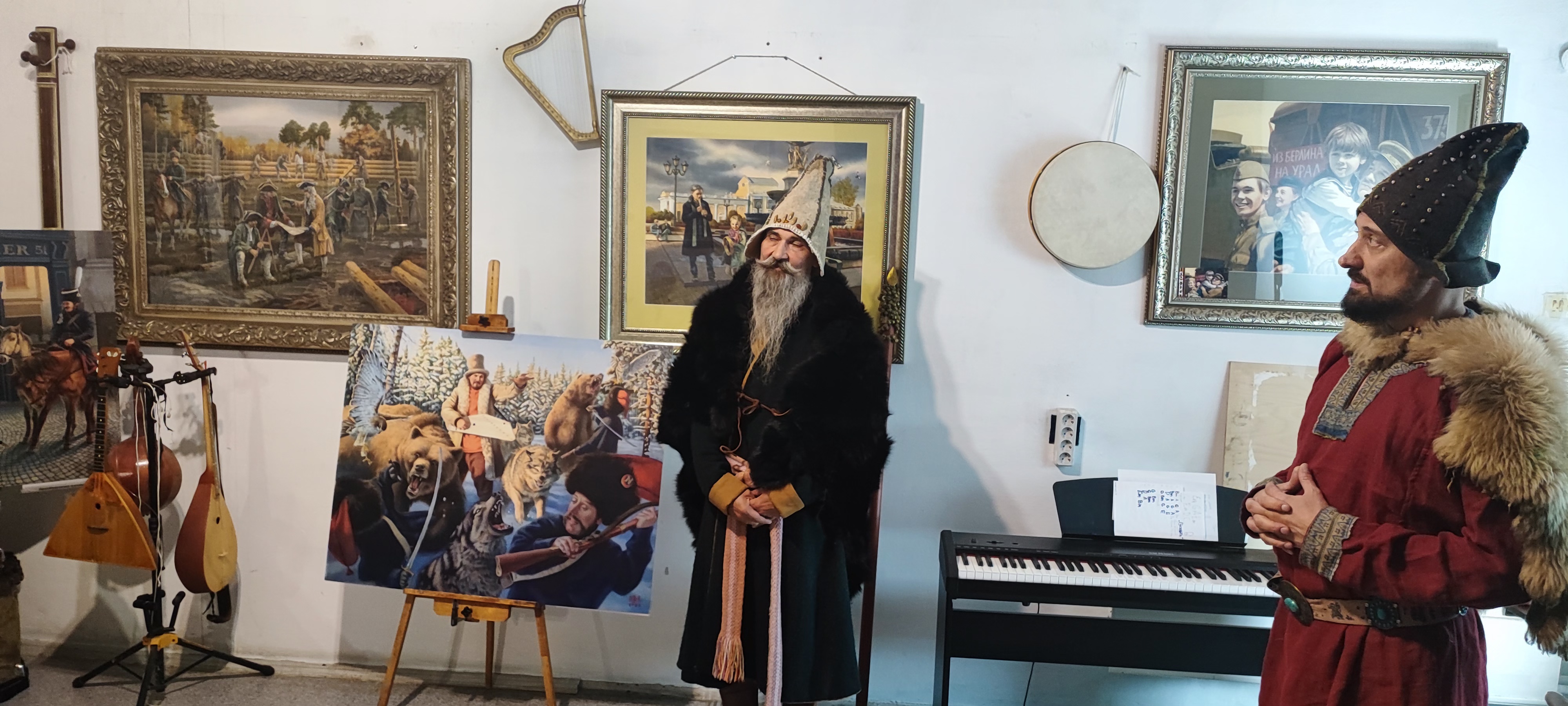 Мастерская Уральского эпоса - это творческий коллектив, в котором объединились историк - реконструктор, писатель, художник, профессиональные музыканты и исполнители, с целью воспеть через авторские песни и картины наш родной Южный Урал. Экскурсию по картинам об историческом и современном городе провел лично сам руководитель мастерской, художник-акварелист и реконструктор Михаил Воронов - Кушаковский. Под вкусный чай, дети и родители дорожного семейного клуба побеседовали с коллективом мастера, узнали об их новых идеях и творческих задумках. Семьи смогли окунуться в атмосферу творческой лаборатории, рассмотреть старинные костюмы, оружие и предметы быта, услышать звучание старинных музыкальных инструментов, и послушать песни и сказы о славных подвигах предков.