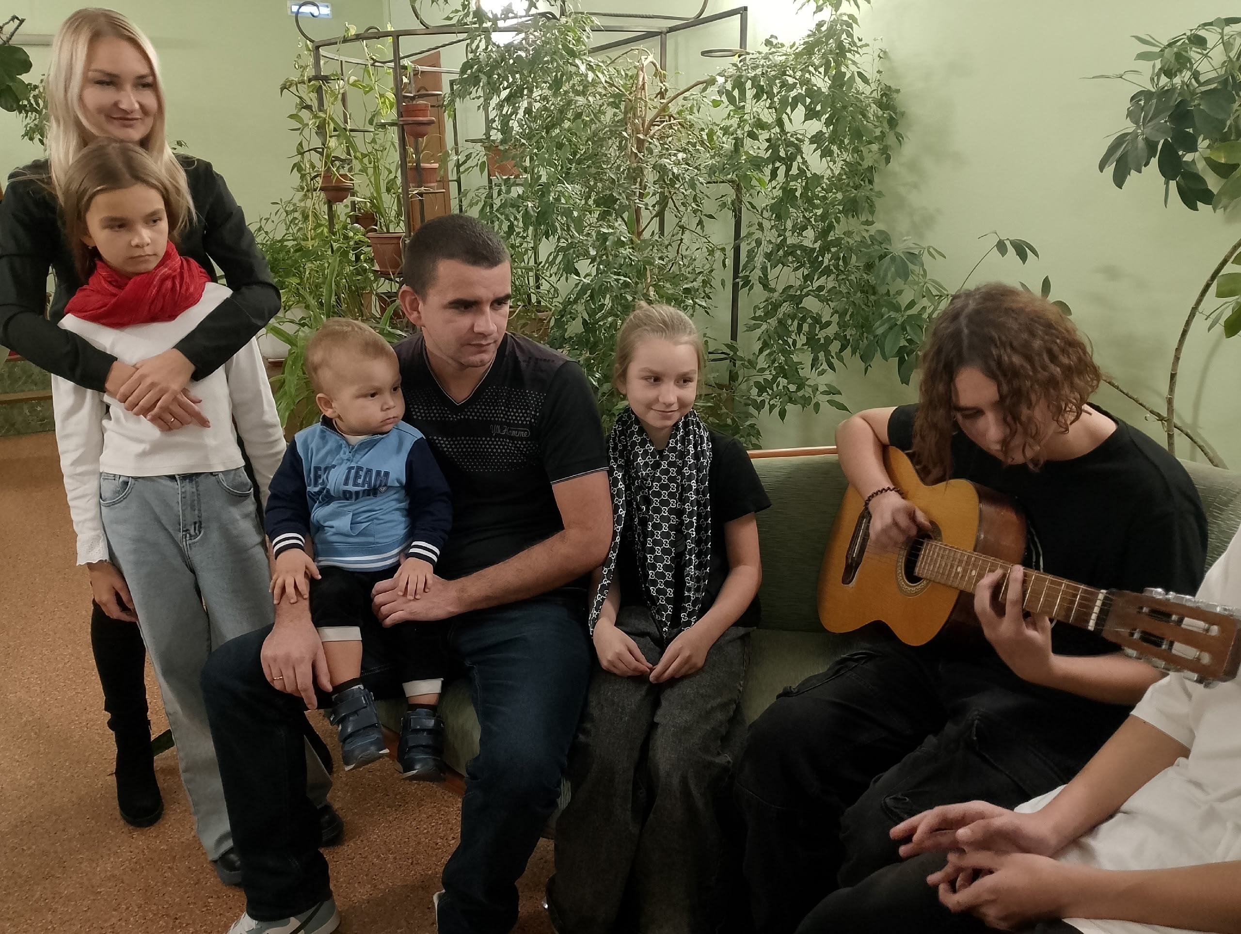 Семейный концерт среди зелени: участники проекта устроили душевный вечер с гитарой в зимнем саду.