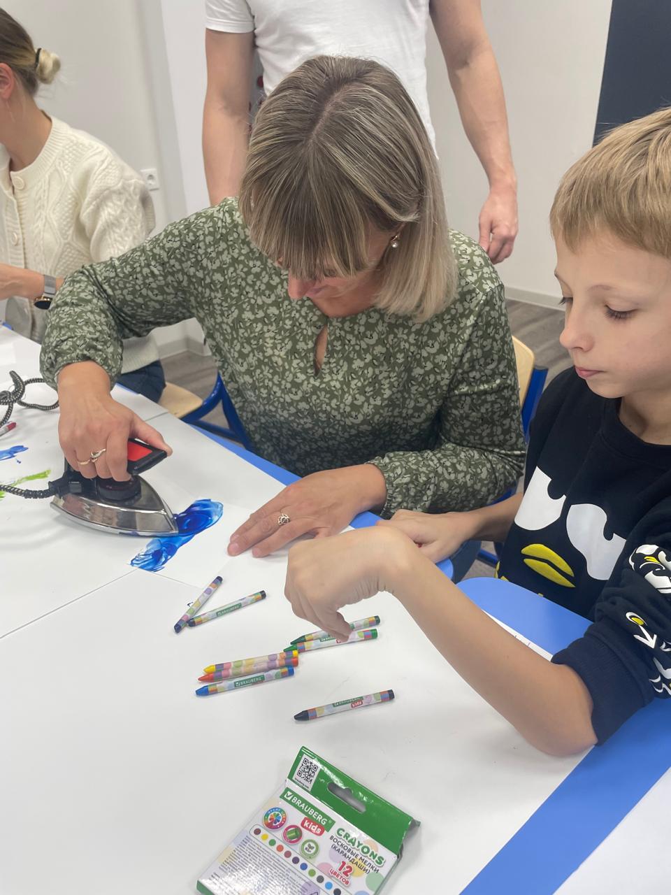 Семьи учились наносить расплавленный воск на подошву утюга и создавать фоновые заливки. Они пробовали различные техники: рисование кончиком и ребром утюга, создание узоров и фактур.
