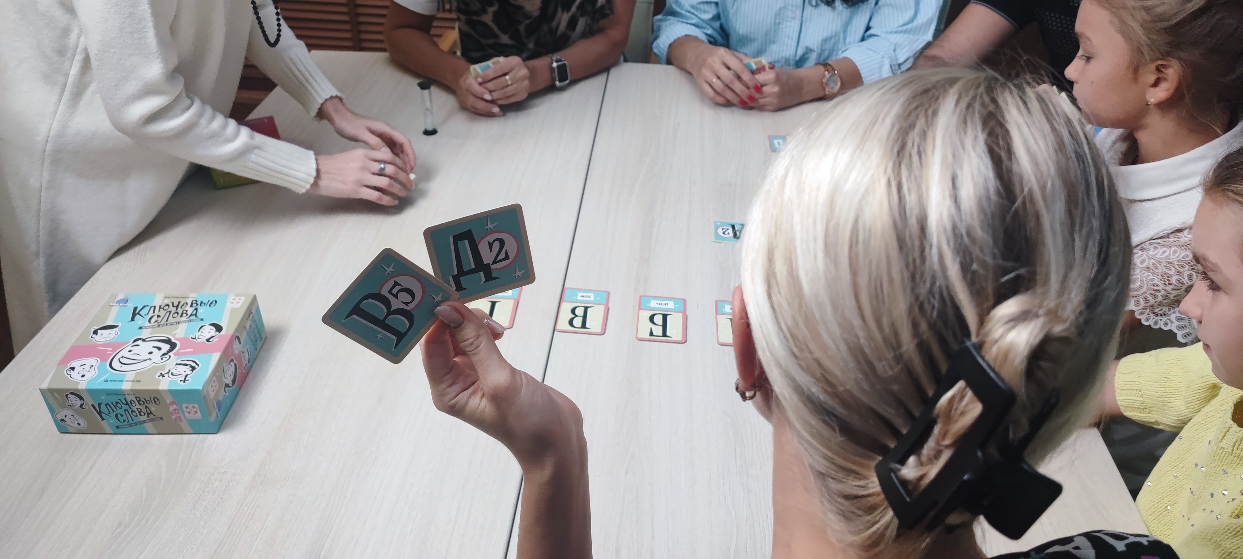 Больше всего семьям понравилась игра «Ключевые слова» - девиз которой «Понимайте друг друга с одного слова». Суть игры – ассоциативно придумать «подсказку», которая объединяла бы два ключевых слова. Эта игра подходит для любого возраста, так как слова простые, а свои ассоциации игроки могут выстроить на своём уровне знаний, а также используя смекалку и юмор.